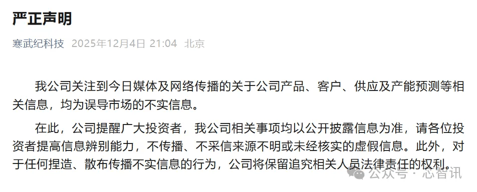 针对有联系媒体报谈称寒武纪2026年东谈主工智能(AI)芯片家具将普及三倍以上的音书,12月4日晚间,寒武纪发布严正声明称,该音书为空虚信息。