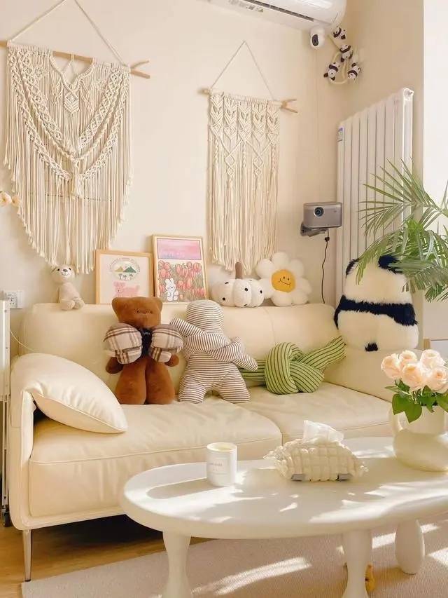通过精雅挂毯、有趣抱枕以及绿植等物品的箝制,诚然显得客厅很满,可是会给东谈主一种生计气味,同期也展现出了小女生可儿俏皮的一面,莫得哪个女生能阻滞这一切~