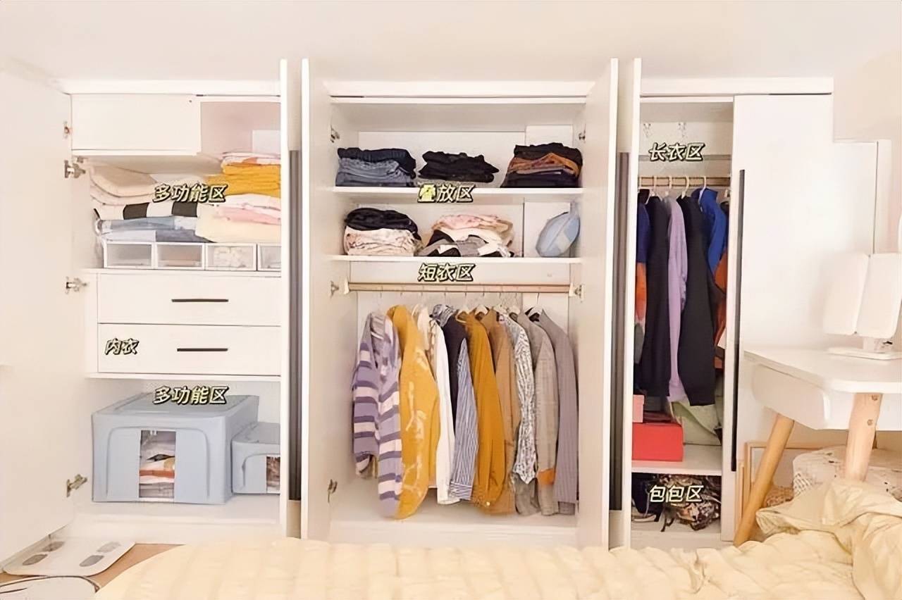 且衣柜里面的区域远隔也很明确,有多功能区、叠放区、短衣区、长衣区等,每项都分得纯洁净白。