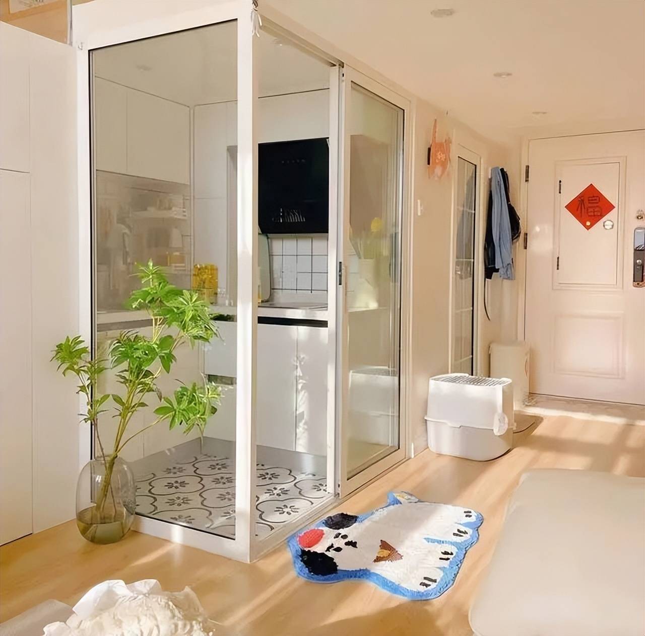 紧挨着卫生间的是厨房,从这个推拉门外不错看到里面的约莫情况。L型的橱柜,可能在东谈主们看来,不如U型讹诈率高,但咱们也要计划厨房的一面有玻璃阻碍,若是在这样作念橱柜,可能会影响好意思不雅~
