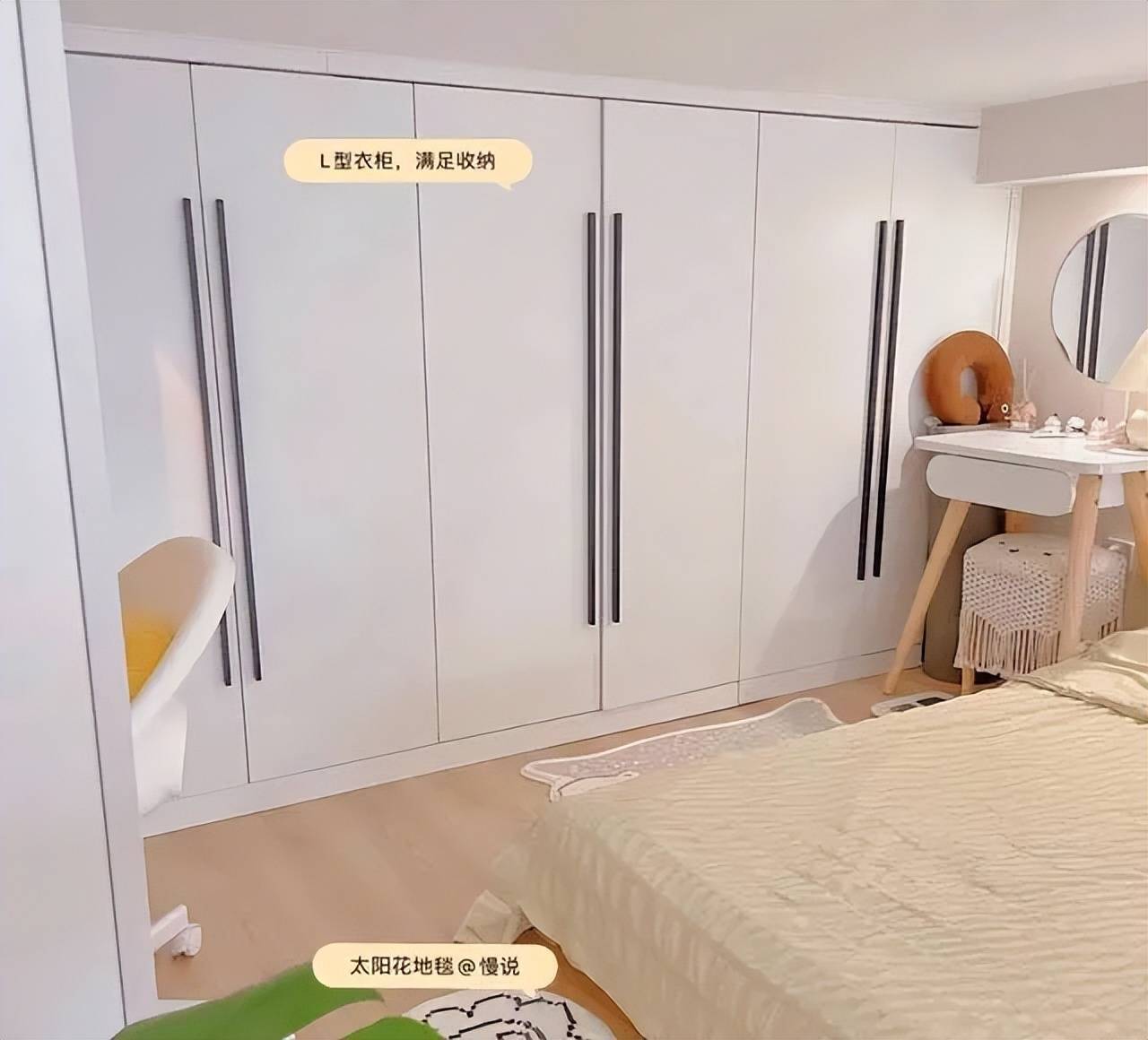 这仅是衣柜的小部分,在另一侧,不错说是满墙的衣柜,其实这加在沿途便是L型衣柜+书桌,这种衣柜太棒了!