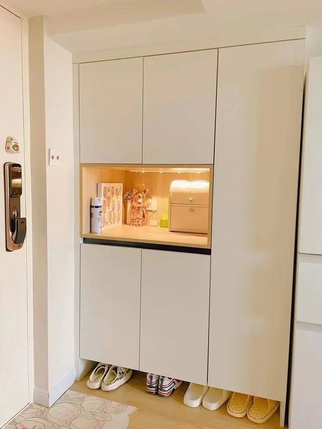 参加门后,左侧有个玄关柜,和门的情态很搭,都是干净的白色,玄关柜最下方举高了10cm,不错用来放日常穿的拖鞋,每次脱穿很简便。何况玄关柜中间有块灵通式区域,不错安祥爱的摆件,起到箝制作用,同期又能收纳钥匙这些。