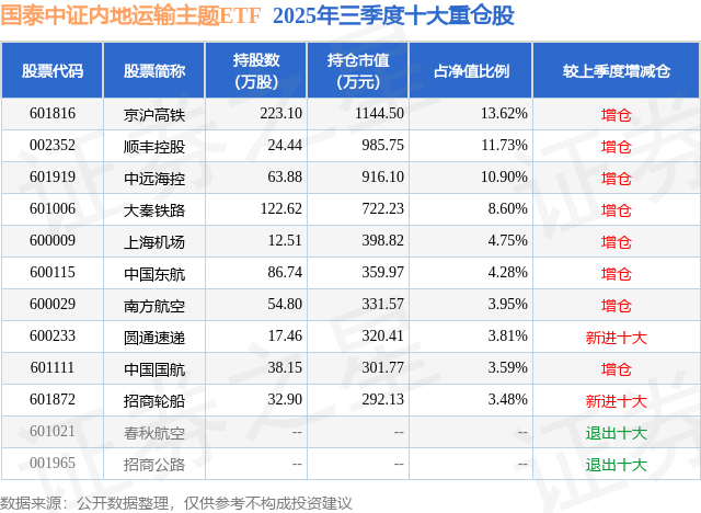 本站音书,日前国泰中证内地运载主题ETF基金公布三季报,2025年三季度最新限制0.84亿元,季度净值涨幅为-1.48%。